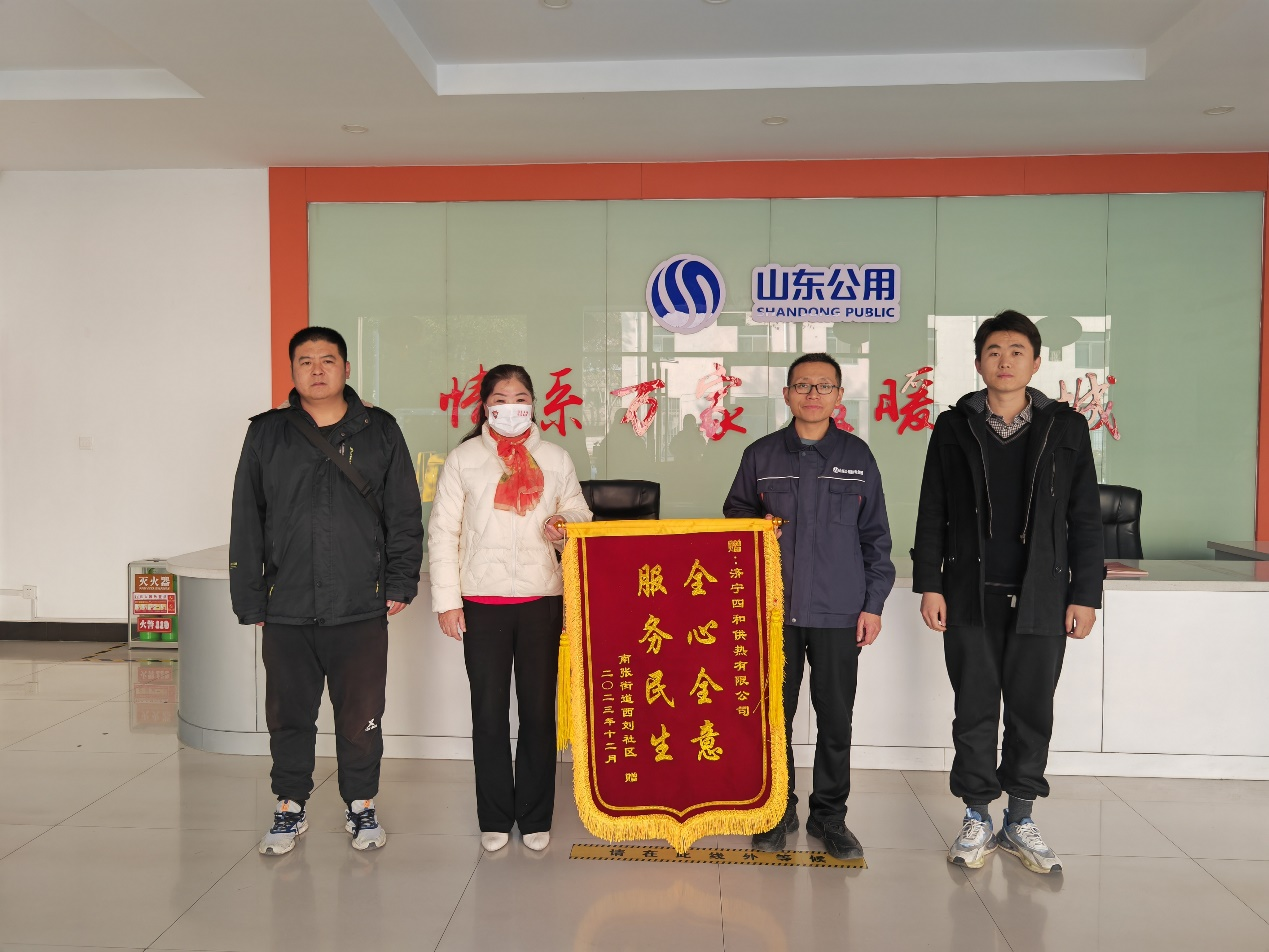 12月5日下午,南張街道西劉社區(qū)的負責(zé)人將一面印著“全心全意,服務(wù)民生”的錦旗送到了濟寧四和供熱公司,誠摯地對四和供熱公司的周到服務(wù)以及供熱六區(qū)網(wǎng)格員朱道新的認真負責(zé)表示感謝。